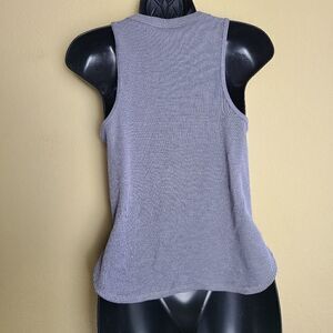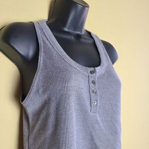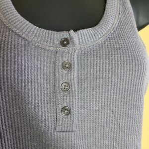 This is a crop top by Wild Fable. It is light grey and Henley style with buttons on the chest. This crop top is waffle knit. Note that it is longer in the back than in the front.