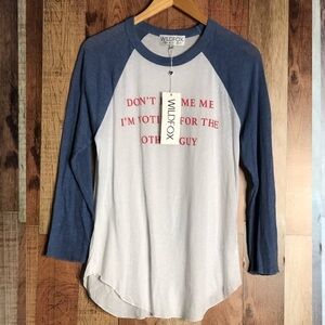 New with tags! Size small, Wildfox Drapey heather-knit baseball tee printed with a tongue-in-cheek message about your candidate of choice. "Don't blame me. I'm voting for the other guy"
