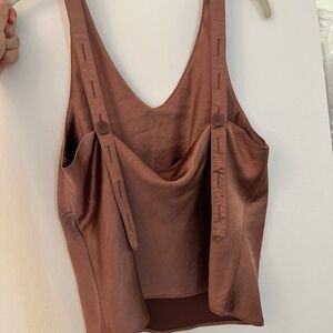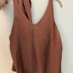 Size small (unisex). Very versatile satin top with adjustable straps (long enough to wear crossed/racerback-style) and with optional scarf. Color is a metallic coppery pink. Worn only once or twice.