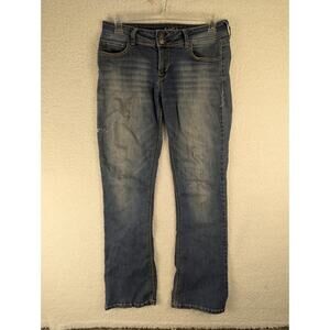 The Wildflower Denim Blue Jeans for women in size 9 feature a solid pattern with a zip and button closure. Made from a blend of polyester, spandex, and cotton, these jeans have a denim fabric type and a 5-pocket design. The stretchy material offers a comfortable fit, while the bootcut style adds a trendy hipster touch. Perfect for any season, these machine washable jeans are a stylish and versatile addition to any wardrobe.