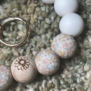 Stylish keychain bracelet with wildflower designs and solid silicone beads. Features cream , green, and multicolor floral beads. Perfect for adding a touch of elegance to your keys.