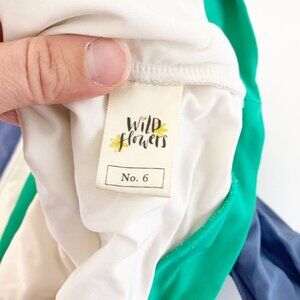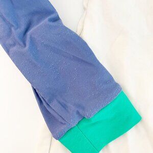 Great swim top from wildflowers! Raglan style rash guard with blue sleeves, green trim and white body. GUC for some pilling and embedded sand- see pics