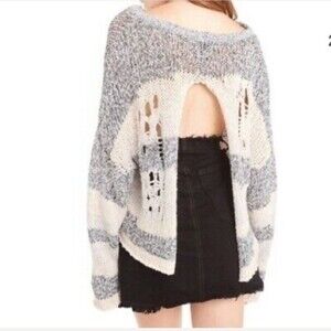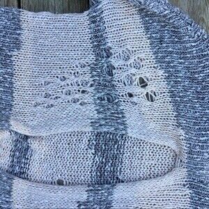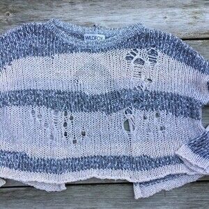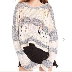 Deconstructed Haven Sweater is pure heaven.The Haven Sweater is a crew neck Open knit distressing featured front and back. All over stripe knit pattern in gray and beige In our soft, chunky tubular yarn.
