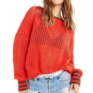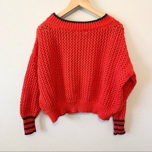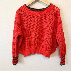 Wildfox Couture Mila Open Knit Sweater. No size tag but measures to size small. Measures 26.5” across the chest laying flat and about 18.5” long from shoulder to bottom hem. Red open knit sweater with blue neckline and blue stripes at cuff. Made of 100% cotton.