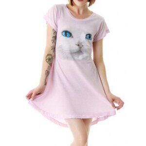 Doll's Kill description: "The ever popular Wildfox Couture digital cat that was made famous on their tees and baggy beach jumpers is now available on a dress! This comfy dress is thin enough to wear on hot days and the open and draped back will allow you to show off some skin while staying cool. The flared bottom gives this precious dress and yer bod some shape, so reach for this sik signature Wildfox Couture piece! 100% Cotton. Our Doll is 5'8"."