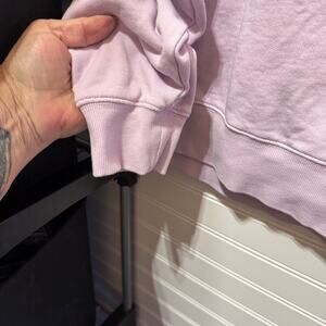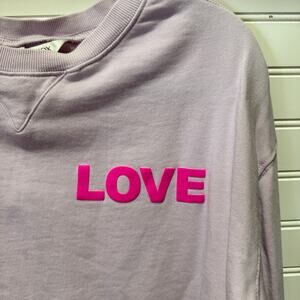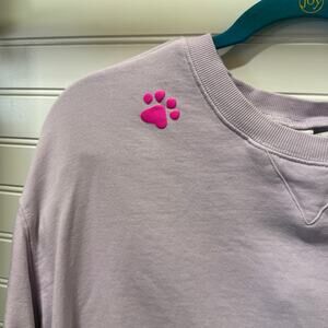 The sweatshirt is a warm crewneck style. It is lavender purple in color with pink graphics. The sweatshirt says Love on the front and has a paw print. The back of the sweatshirt says, Dogs Love Me. There is also a paw print on the left sleeve. Perfect for the animal lover! It's 100% cotton.