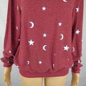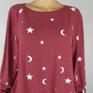 Machine washable polyester/rayon/spandex. Lightweight sweatshirt in a soft brick red with all over white moon and stars graphic print. Size small.