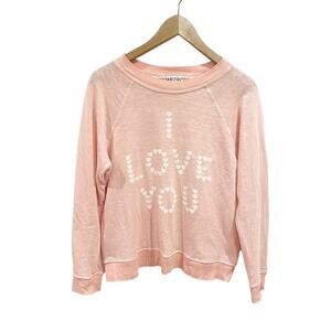 Adorable Wildfox “I Love You” sweatshirt in bright pink with white heart lettering. Lightweight, semi-sheer burnout fabric with a relaxed fit and soft, cozy texture — perfect for layering or Valentine’s season.