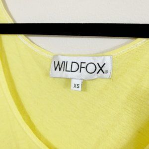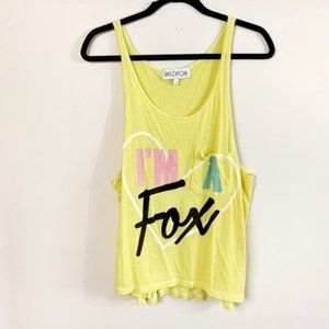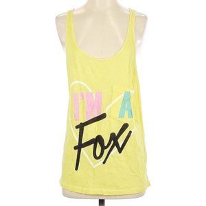 Fun yellow tank from Wildfox with the saying “I’m A Fox” with a heart outline. Bright yellow is attention grabbing and a nice, fun and bubbly uplifting color. Scoop neckline with a loose fit. Fabric has a kind of intentional worn look with light “pilling”. Size XS. Excellent preowned condition.
