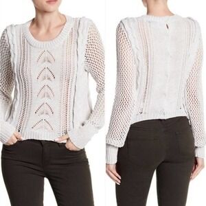 Its time to get cozy in the Wildfox 13th Sweater! The 13th sweater is in our flecked white willow yarn. This silhouette has a high low hem complete with a button back closure. This style has 3 dimensional braids along the bodice and beautifully crafted pointelle details throughout body. In White.