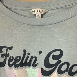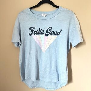 Light blue short sleeve tee with 'Feelin' Good' graphic. Comfortable and stylish.