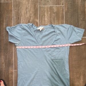 Soft light blue tee with a V-neck. Features a small front pocket. Perfect for everyday wear.