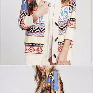 Chic and cozy cardigan with vibrant patterns. Features cream, blue, and red hues. Perfect for a stylish look.