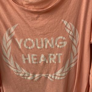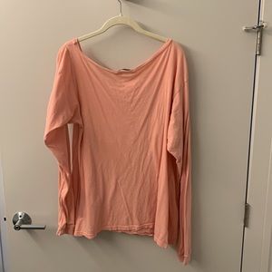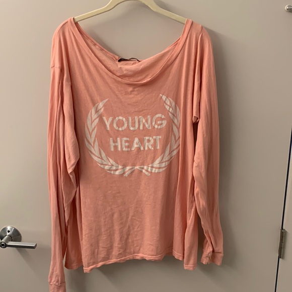 Salmon colored Wildfox top. Size 1. Could got up to a large. I’ve tied it up when I’ve worn it. Really cute. Can also be worn off the shoulder.