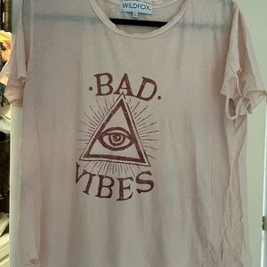 Wildfox pink tee with 'Bad Vibes' graphic. Features an eye within a triangle design. Distressed/ripped design at sleeve and hem.