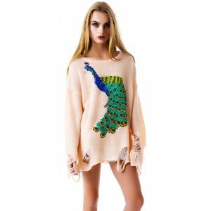 Teal and purple peacock feathers embroidered in sequins that sparkle and shine across this gorgeous sweater. A wide neckline scoops from shoulder to shoulder on exaggerated dropped shoulder seams with long sleeves that drape. Loosely knit oversized a-lined body makes this a cozy and comfy fit. Rips and distressing along edges of the hem give a vintage, worn in vibe.