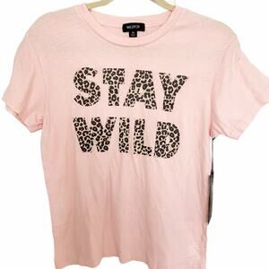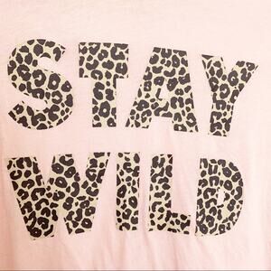 Lotus (pink) 100% cotton tee with animal print graphic text "Stay Wild". Distressed neck, sleeves and hem. Size XS. NWT.