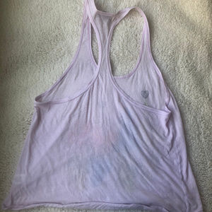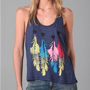 This scoop-neck, racer-back jersey tank features a feathers graphic. 1" straps. Size M.
