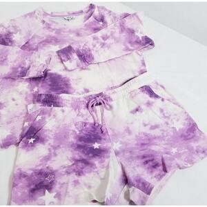 Super cute and comfy Wildfox lounge co-ord set! This set includes a sweatshirt and matching shorts, both featuring a trendy tie-dye pattern with star accents. Perfect for relaxing at home or a casual day out. Grab this adorable set now and add a touch of fun to your wardrobe!