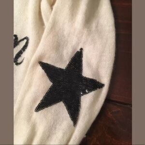 Keep it cozy in the season’s softest knits. Wildfox White Label Angora mix sweater with "Dream" written in sequins across the chest and stars at elbows in sequins.