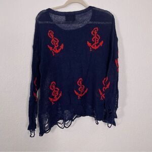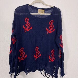 Great pre-owned condition Wildfox White Label Navy Blue with Red Anchor Print Distressed Hem Sweater