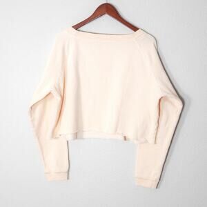 Wildfox cropped sweatshirt in a soft peach tone with a floral heart flag graphic across the front. Women’s size small. Raw hem with a wide neckline and raglan sleeves. Cotton blend with a cozy terrycloth interior. Made in Los Angeles. Relaxed fit with just the right amount of drape — not clingy, not stiff. The floral flag print combines vintage Americana with a romantic twist.