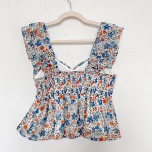 Wildfox ruffle-strap floral tank top with sweetheart neckline and smocked back. Features a blue, orange, and white daisy print. Size Medium. 100% polyester. Made in China. Excellent condition. No visible flaws. See all photos for details.