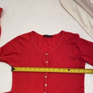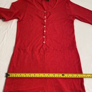 Wildfox red thermal MERRY onesie pajamas or base layer. Button front. Super soft. Measurement from the crotch seam to the bottom of cuff is approx 28.5”. Length from top to bottom is approx 55”. Essential fun and functional style for the winter holiday season. Excellent condition. Smoke free home.
