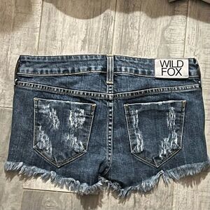Wildfox Friday night distressed / destroyed jean shorts. Sexy denim cutoffs. Medium stone wash. Purposely shredded holes and frayed hems. Has the iconic wildfox label on the back hip. 5 pocket styling with single button clpsure amd zip fly. Perfect for spring and summer. Light stretch. Made in USA.