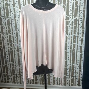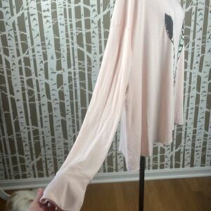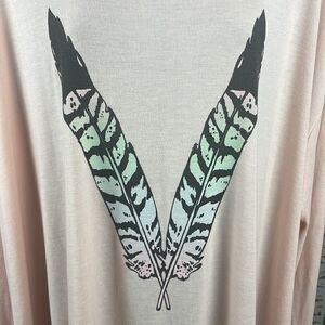 Wildfox Oversized Feather Print Boho Long Sleeve Shirt. Features ultra soft rayon blend fabric in a soft pink/peach color with oversized crossed over feathers printed on the front, long sleeves with wide banded cuffs, unsewn cut hemline that drops lower on the sides, center seam down the middle of the back. Gently worn and laundered with just some light pilling overall and heaviest around the cuffs (see last 2 pics). Size Medium but is very oversized and could possibly fit up to XL - see measurements to verify fit. A comfy and cute shirt that will be your go to for lounging!