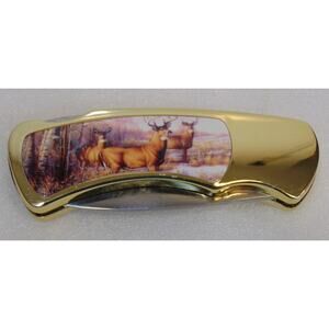 Wildlife Lockback Buck Deer Knife Collectible Tin Stainless Steel Blade Indian Feathers Emblem Gold Tone Hunting Fishing Display Collector Christmas or Birthday Gift Present