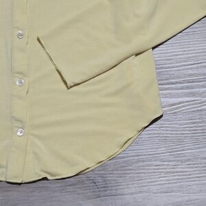 In pre-owned condition, Light puckering at collar, Light Yellow, Button front closure, Soft Flowy, Versatile Business Casual or Lounge Pajama Top, Stylish yellow button-up shirt with long sleeves. Wilfred Aritzia Pose Jersey Yellow Button-Up Tencel Lyocell Soft Shirt, Size L.