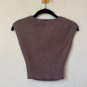 Sleek and sculpted ribbed knit crop top from Wilfred (Aritzia) featuring a modern cutout waist detail and cap sleeves. Made from a luxe wool-blend fabric in a soft taupe-brown hue for a flattering, fitted silhouette. Size XS.