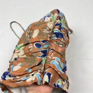 Wilfred Aritzia Tan Floral Printed Linen Fatale Camisole Tank Top. Molten camel/soft blush. Cropped. Ruched front. Removable straps. Adjustable straps. Abstract floral print. Invisible side zip closure. 100% linen. Retail: $88. Size 0. Armpit to armpit: 14". Length: 15.5". (853)