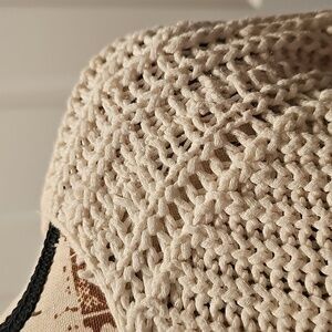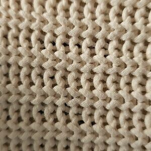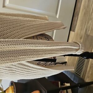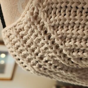 Elegant beige knit sweater. Soft texture. Has some natural stretch. Cable net side splits. Classy Perfect for layering. I dressed it up with some vintage beads. Add black and brown leather boots and black or blue jeans tucked inside. People will point you out!