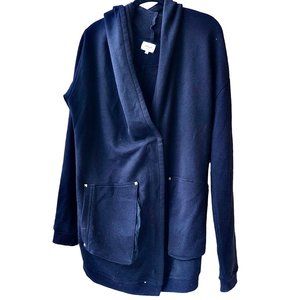 Wilfred black cocoon comfy cardigan sweater with partial zipper and one snap. Two front hand pockets. Cotton + Modal soft sweatshirt-like fabric.