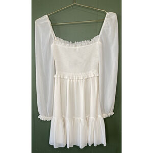 Aritzia Wilfred Tempest Smocked Chiffon Mini Dress. Women's Size XXS. NWT MSRP $159. Hidden side zipper, dress is lined, no pockets, has a zig zag hem.