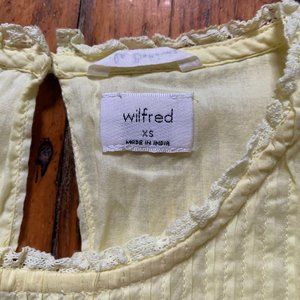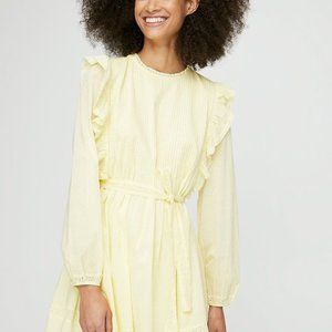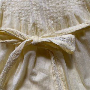 This mini dress has a high lace collar, ruffle detailing, and lantern sleeves. It's made with a lightweight, semi-sheer, 100% cotton fabric.