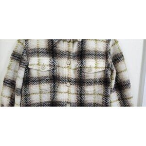 This is a Wilfred Free The Ganna long shacket in size small. It is a gray plaid wool blend jacket with a shirt style. The outer shell and lining material is wool blend. Perfect for women looking for a stylish and cozy outerwear option.