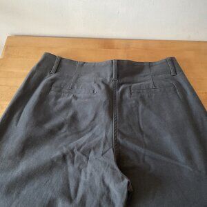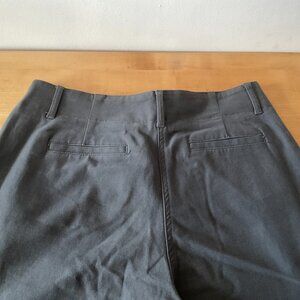 These are high-rise utility pants with a straight waistband, darted back waist and slash hand pockets. They’re made with soft-brushed cotton sateen. Very good condition with one spot on leg shown in picture.