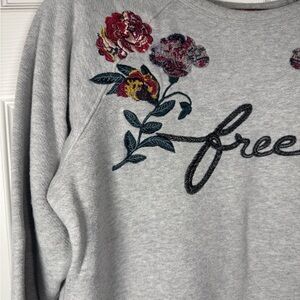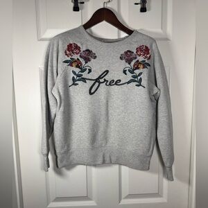Features a large floral embroidery on the from with the word “free”, cropped fit, Crewneck, fleece interior, light wash wear but otherwise great condition.