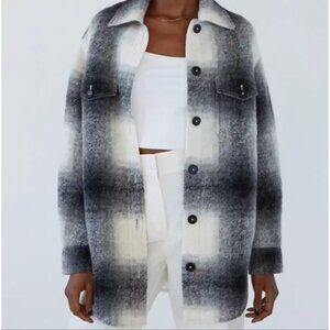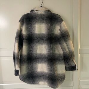 Cute black and white plaid shirt jacket. This is a relaxed-fit, workwear-inspired utility jacket with patch pockets, dropped shoulders, and a rounded hem. It's made with an Italian alpaca-wool blend.