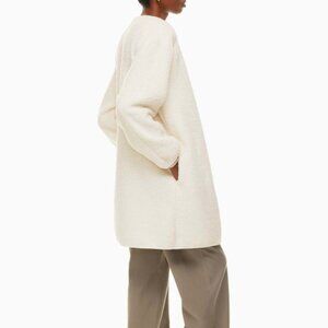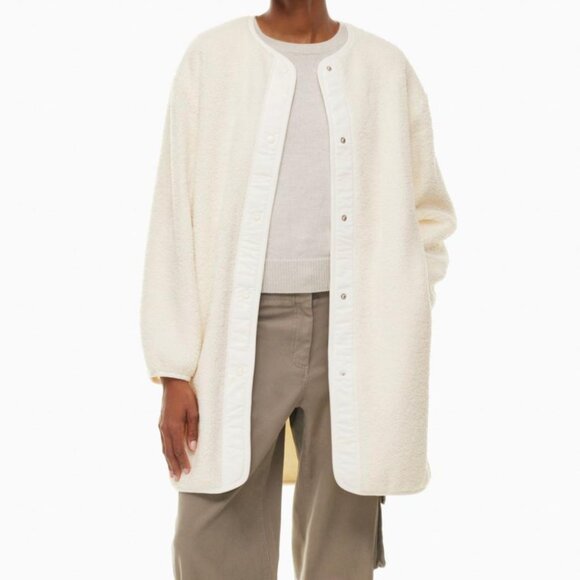This is a cozy crewneck liner jacket with snap closures, inseam pockets and dropped shoulders. It's designed to be worn on its own or as a toasty extra layer under jackets. It’s made from plush, textural sherpa fleece.