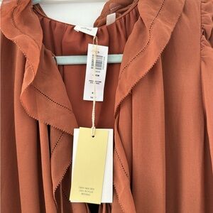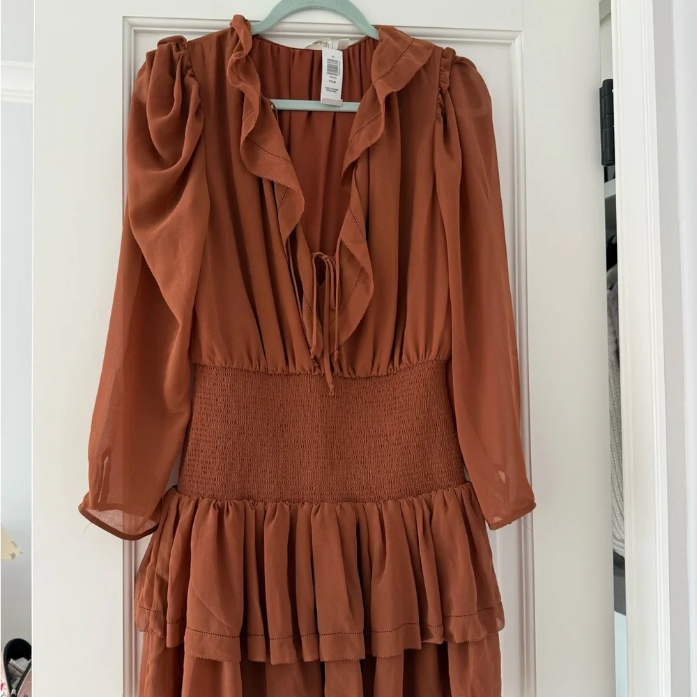Elegant rust dress with ruffle details. Long sleeves for a stylish look. NWT never worn.