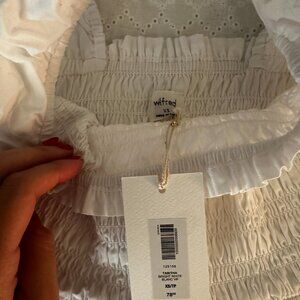 This item was final sale, but it arrived with this stain. This is a smocked sleeveless top with a square neckline and peplum hem. It's made from breathable cotton poplin with a crisp, airy feel that’s smooth to the touch.