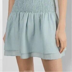 This is a V-neck mini dress with a smocked bodice for a versatile fit. It's cut from soft, drapey fabric made with linen and TENCEL™ Lyocell.