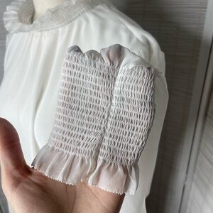 ✨ Wilfred Valencia blouse in white. Ruffle neck detail. Smocked ruffle cuffs. Keyhole back detail. Delicate fabric. A few small spots, refer to last three photos. Good used condition.