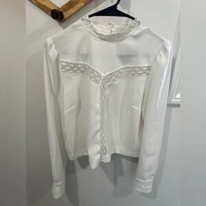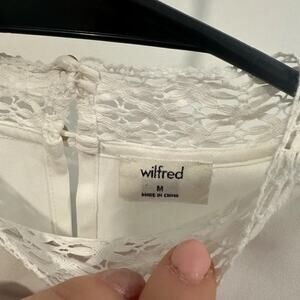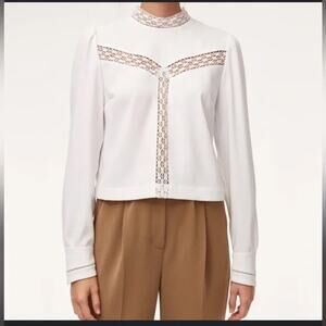 New without tags Wilfred Delaney blouse in crisp white. Elegant and structured, this blouse features sheer lace insets at the neckline, chest, and cuffs. Tailored with a slight crop and mock neck for a refined silhouette. Made from soft, drapey polyester with a smooth feel and light sheen. Office-appropriate, evening-ready, or perfect under a blazer.