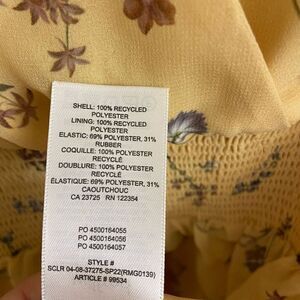 Light yellow chiffon dress with lined body. Long sleeves, unlined. Smocked waist. Inside tag has marker on it, as shown.