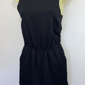 BY WILFRED, HERE IS AN ADORABLE ROMPER FOR SUMMER. IT IS 100% BLACK POLY AND THE 2 SIDE POCKETS ARE LINED IN RAYON. IT FEATURES A SCOOP NECK AND OPEN BACK WITH A BUTTON AT THE NECK. THE WAIST IS ELASTICIZED FOR COMFORT. EXCELLENT CONDITION! SIZE XXS, BUT WILL FIT UP TO A 2~PLEASE NOTE THE MEASUREMENTS.